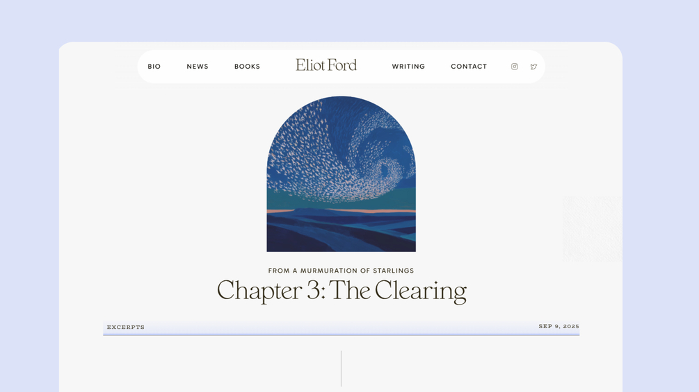 - Book Page: Highlight your featured book with a synopsis, chapter preview, testimonials, and direct purchase links.